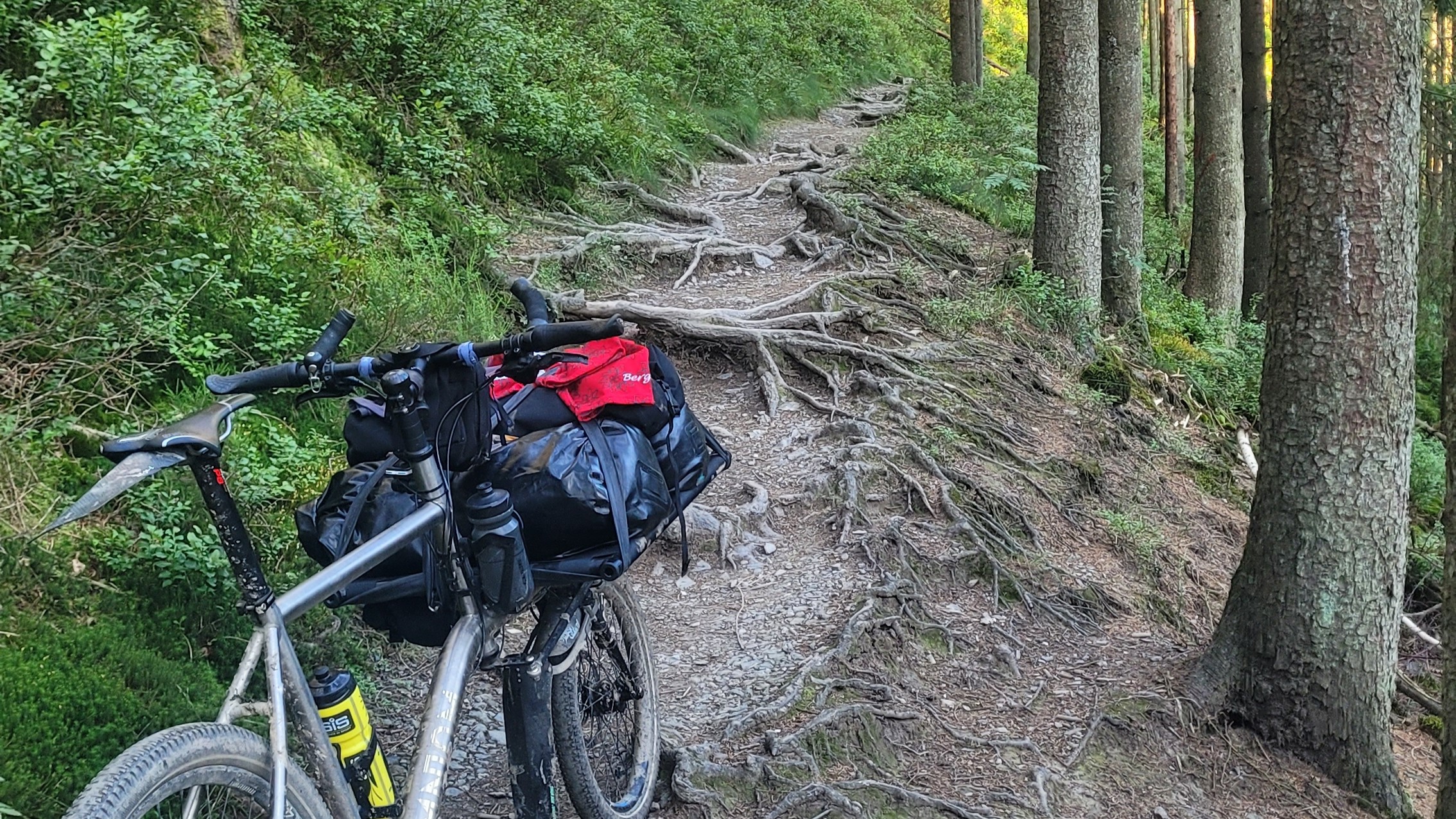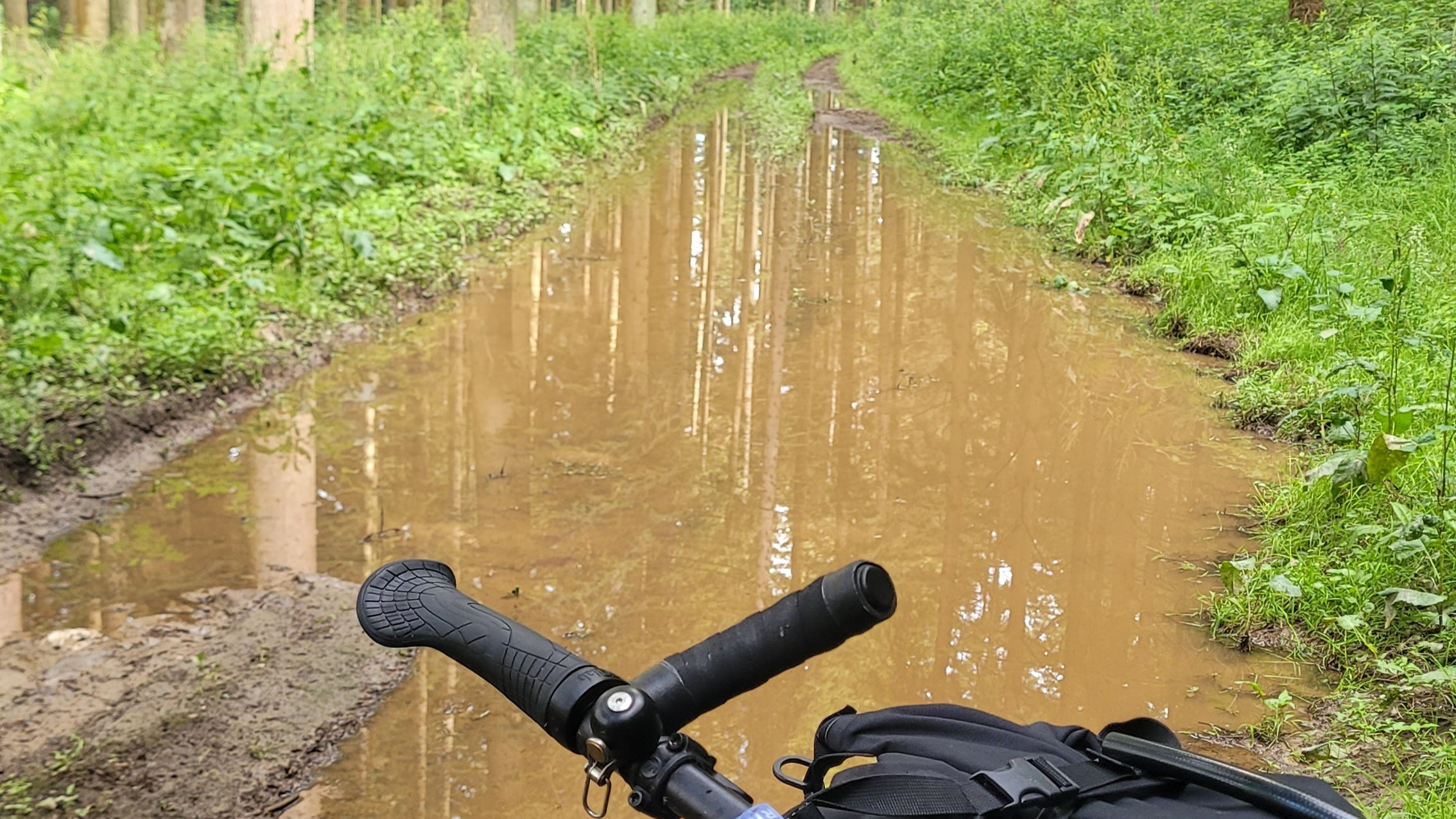 Das setzt sich auch an Tag 3 so fort, trotz der Hitze immer wieder Schlammlöcher (in einem von ihnen landet man dann, wenn man nicht so richtig mit dem Kopf dabei ist), dann mit Gras überwucherte und kaum erkennbare Wege, als Highlight ein schmaler Weg mit Unmengen an freigelegten Wurzeln, die schon das Laufen ohne Rad schwierig machen So trage ich Rad und Gepäck separat, um die paar Hundert Meter zu überbrücken.