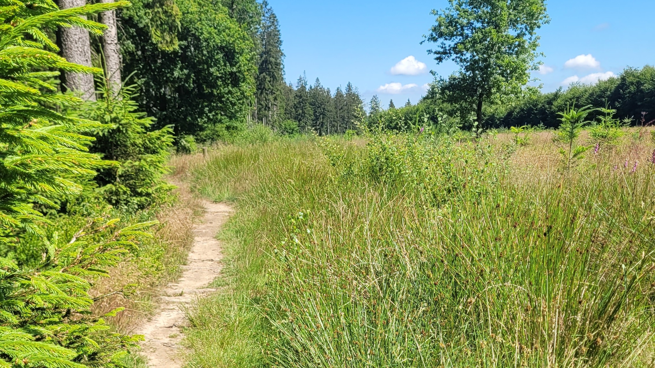 Sonne kommt raus, Strecke umgeht fast alle Orte. Untergrund wechselt, viel Natur. Trotz Hitzeperiode viele Pfützen auf den Wegen, anspruchsvolle Wege, Wiesen, zugewachsene Pfade.