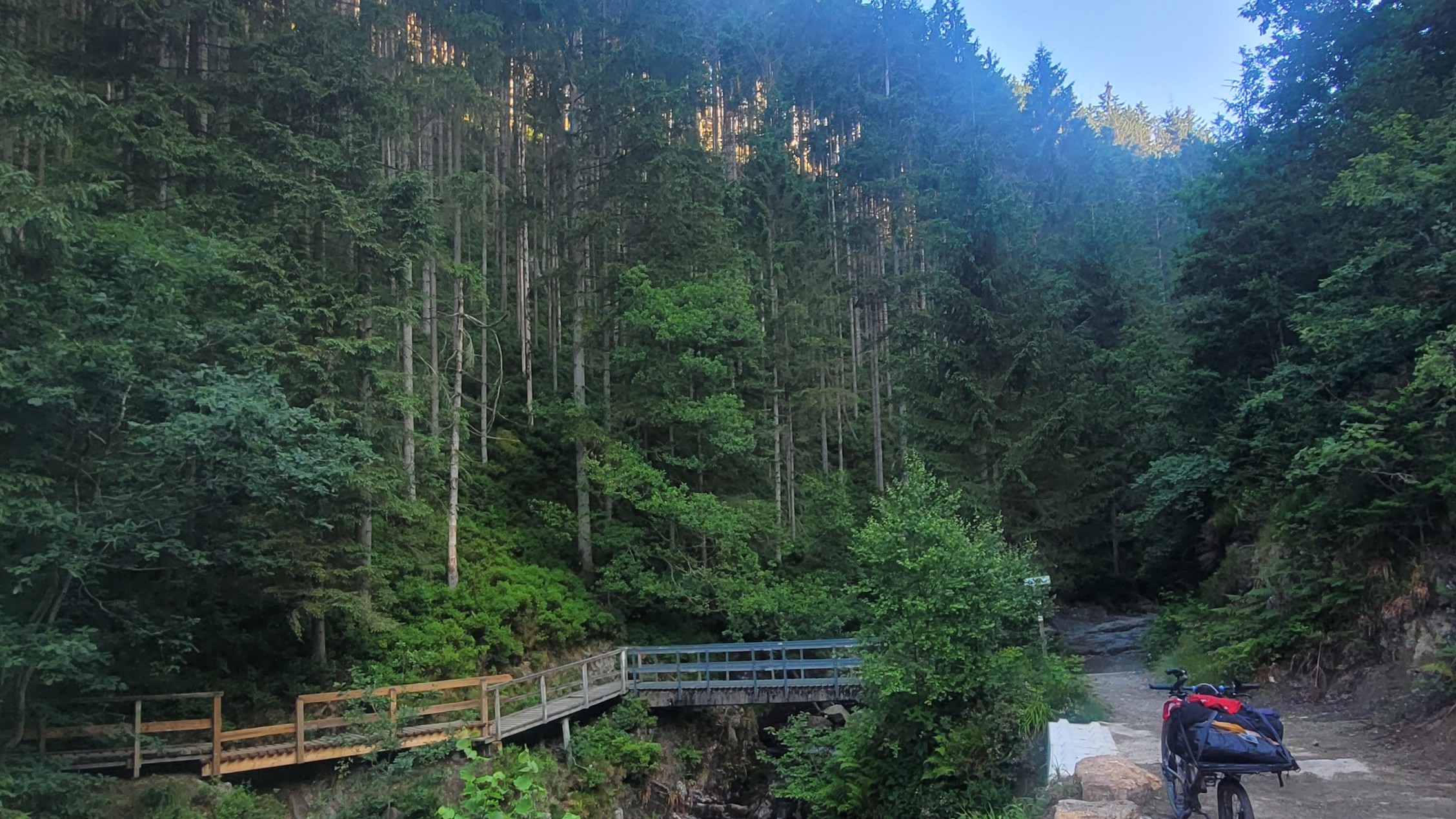 Nacht etwas unruhig, Generator lief durch. 6:15 auf dem Rad. Sonne. Aufwärts auf Straße und Asphalt. Hinter Ferme Libert schmaler Weg, Wurzeln, unfahrbar. Trage Rad und Gepäck einzeln. Und alles ohne Frühstück.