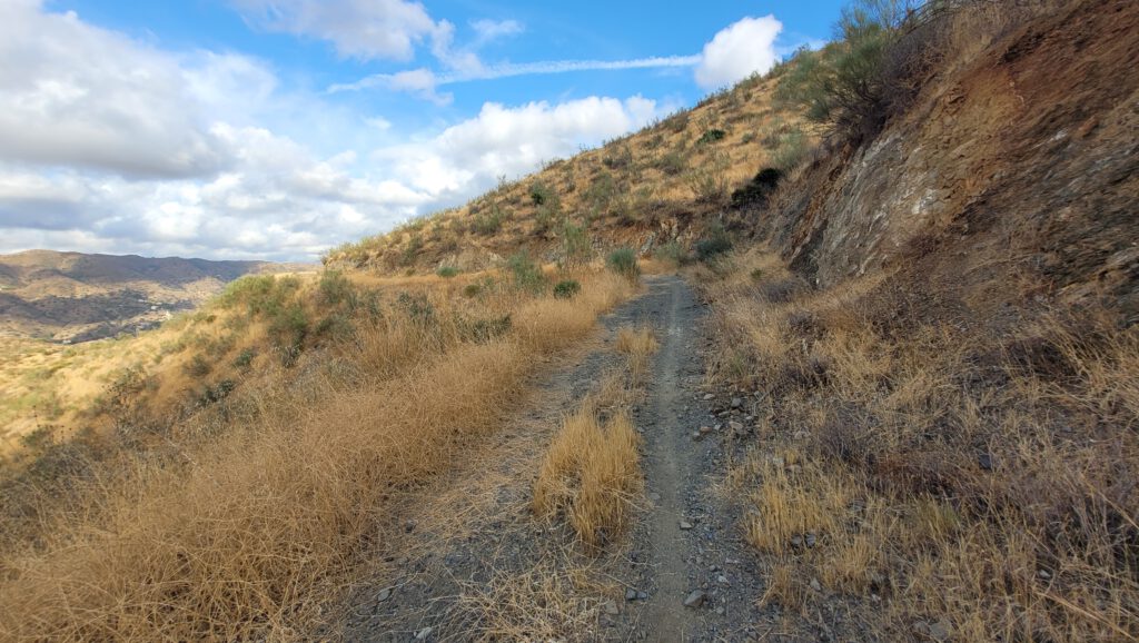 Bis Las Manillas geht es wieder auf der bekannten Strecke Richtung Norden, dann biege ich aber nach Osten auf den Kamm ab. Der Weg wird schnell steil, und der Asphalt verliert sich in grobem Geröll. Auch der hat schnell ein Ende, und der Weg wird zum Pfad. Entlang des Kamms gibt es tolle Blicke, aber auch die ein oder andere Stelle, bei der ich das Rad bergauf schieben muss. Traktion und der für mich ungewohnt schmale Lenker vereiteln das Fahren. Auf die Kräfte, die vielleicht auch nicht reichen würden, gehen wir mal nicht im Detail ein.