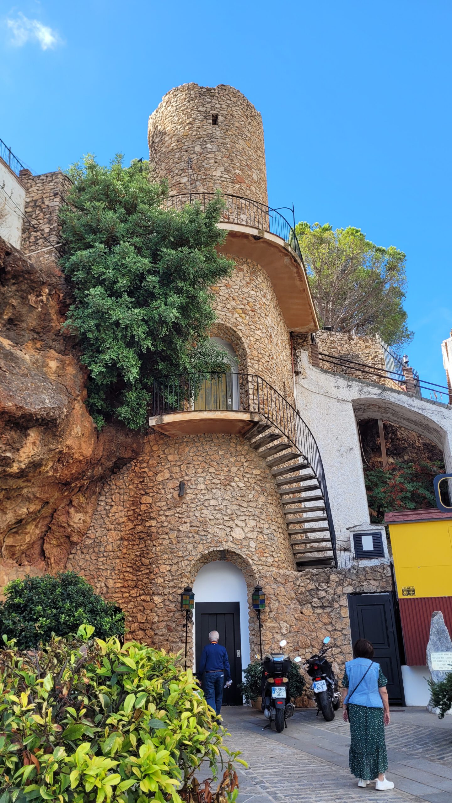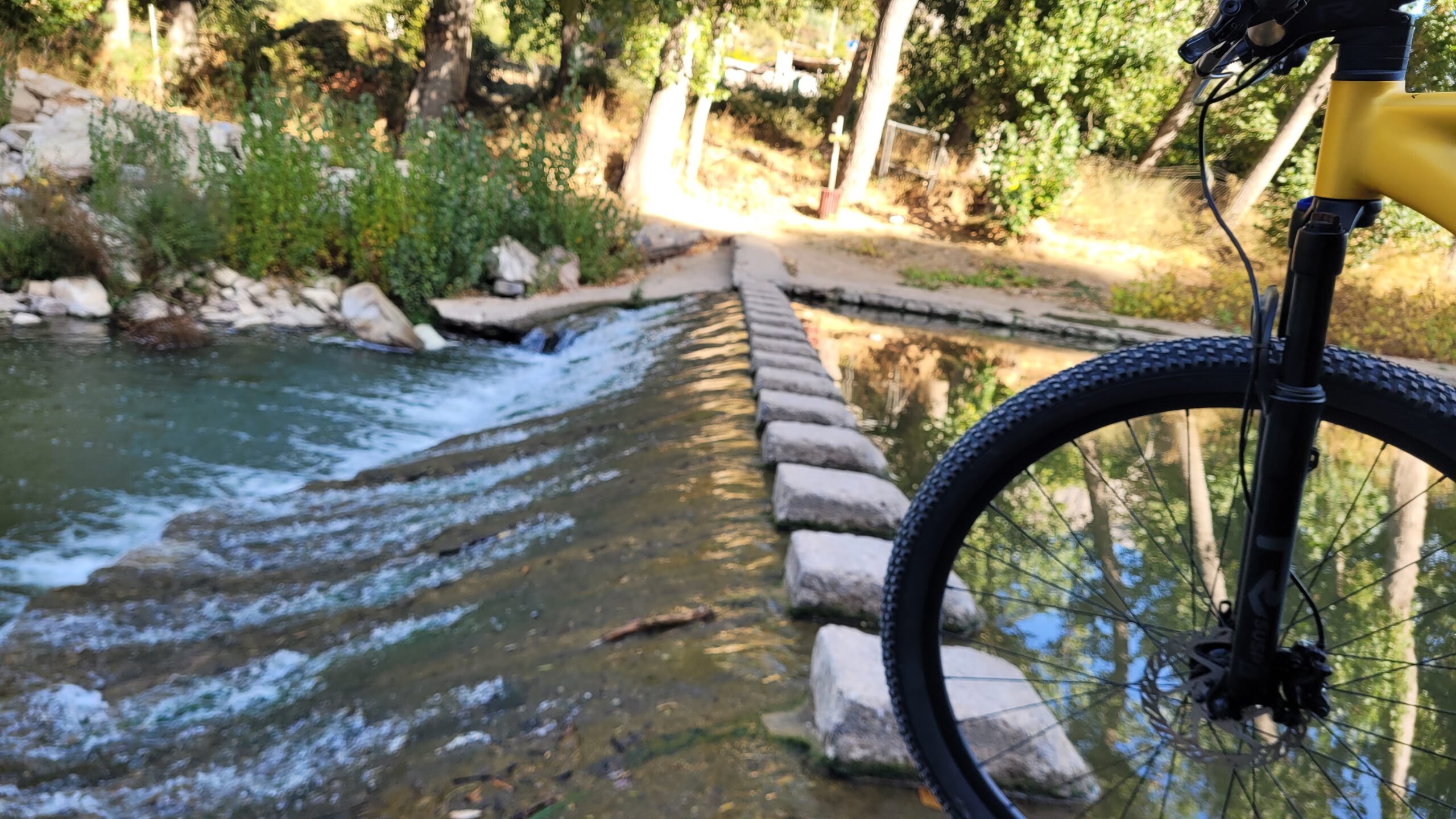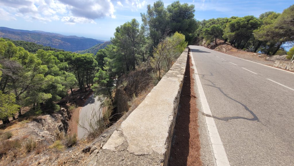 Auf fast 600 Meter Höhe hatte ich eigentlich geplant, in einer Schleife nach Westen abzubiegen, ein großer Zaun und selbst für mich als nicht spanisch Kundigen unmissverständliche Schilder zeigen: Privat-Besitz. Laut Karte gibt es einen Kilometer weiter nochmal einen Weg, der Richtung Westen abzweigt, dazwischen geht es aber nochmal über einen Hügel, der deutlich zu steil zum Fahren ist. In einer kleinen Senke geht es wirklich links ab. Wann der Weg allerdings das letzte Mal genutzt wurde, ist unklar, es sieht eher nach einer Feuerschneise aus, die in Falllinie den Hang runter verläuft. Deutlich über 30% Gefälle, kindskopfgroße Steine und eine kaum erkennbare Fahrspur, mit dem MTB kein großes Hindernis, aber mit dem Gravelbike ein zu großes Risiko. Für mich zumindest. So wird umdisponiert, und ein Schlenker Richtung Osten eingebaut. Am Mirador Francisco Vazquez Sell treffe ich auf eine Straße, und nach einem Abstecher auf den 1032m hohen Reina treffe ich noch ganz unverhofft auf eine besondere Straßenanlage: Vor Boticario macht die Straße 2 360° Schleifen, bei denen ich jeweils zuerst eine Brücke überquere, und danach drunter durch fahre.